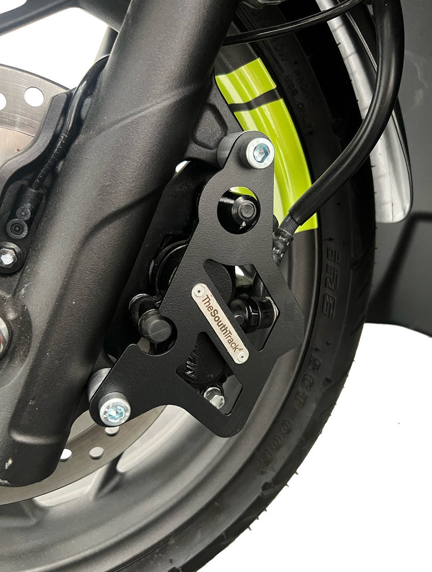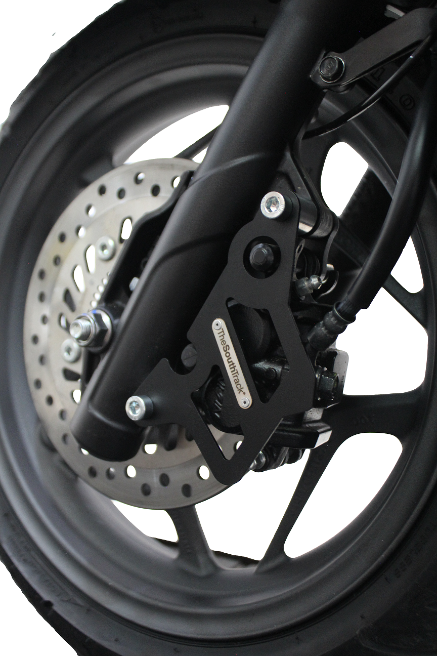 Construida en acero de 2 mm. Su diseño delgado y resistente proporciona protección adicional a la mordaza del freno delantero en caso de ser golpeada por algún objeto extraño.